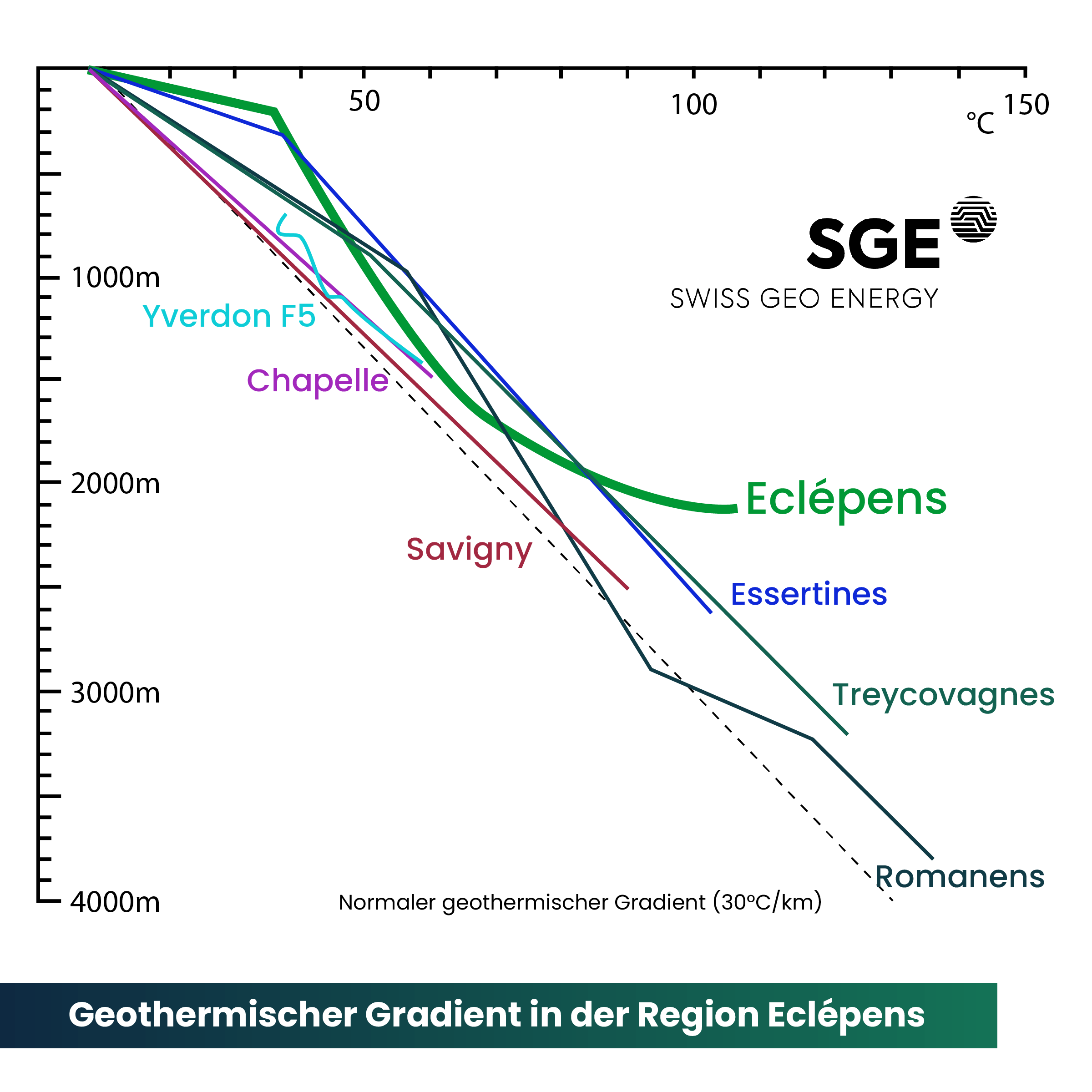 Historische geophysikalische Daten bestätigen das außergewöhnliche geothermische Potenzial von Eclépens. Die Temperaturprofile zeigen deutlich erhöhte Temperaturgradienten im Vergleich zu benachbarten Standorten wie Chapelle und Savigny.