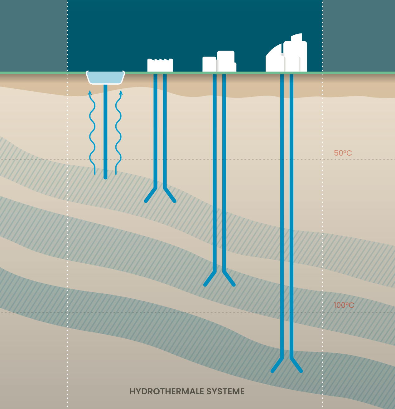 Einsatz hydrothermaler Systeme, die natürliche geologische Strukturen ohne Fracking nutzen und die Grundwasserzirkulation in Tiefen von über 2000 Metern fördern, wo die Temperaturen bis zu 110 °C erreichen können.