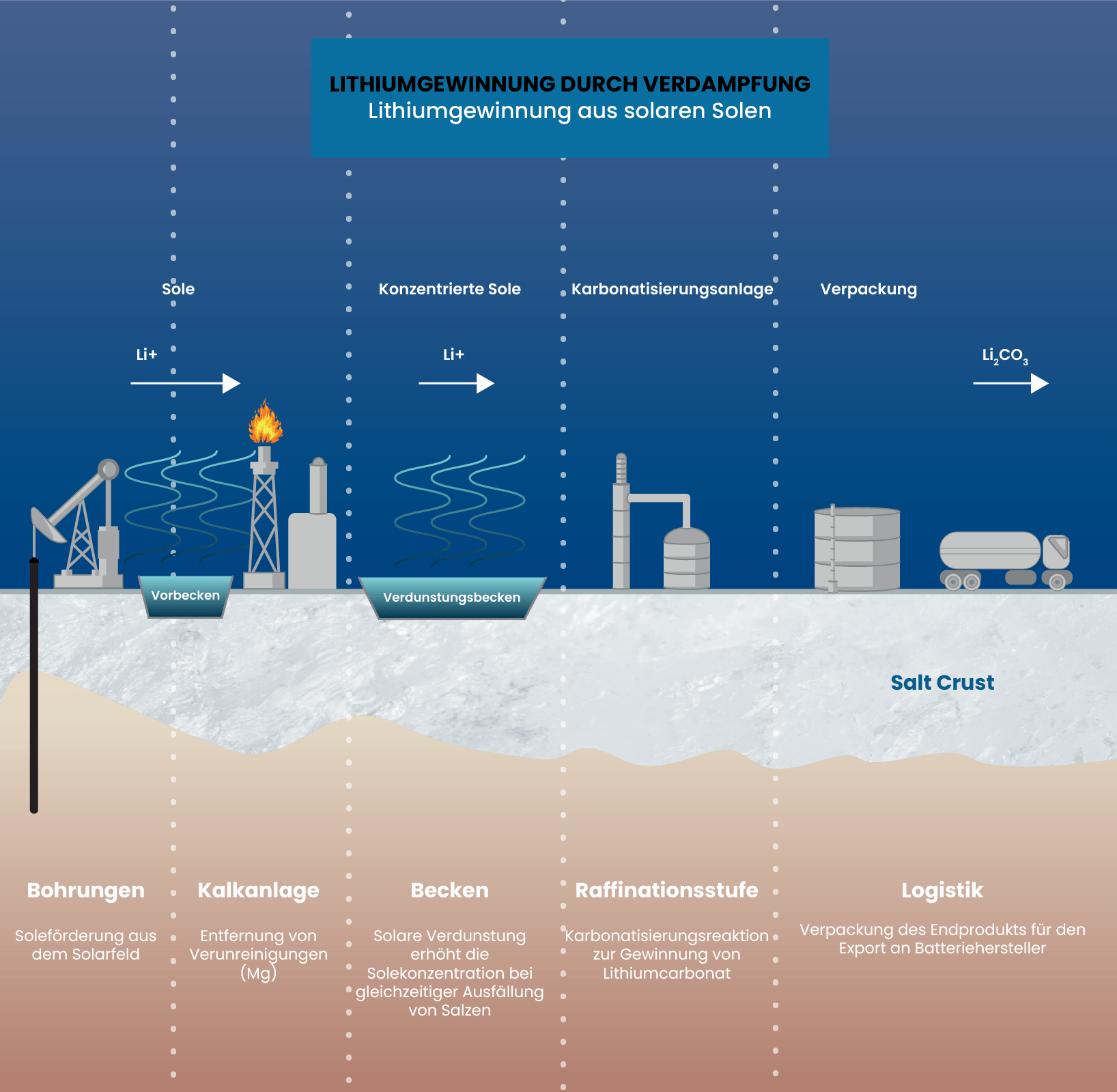 Der Verdampfungsprozess extrahiert Lithium aus Salzsolen mit einem zeitintensiven natürlichen Ansatz. Diese Methode pumpt lithiumreiche Sole in große Verdunstungsteiche, auch Salare genannt, verarbeitet sie in mehreren Stufen und produziert schließlich nach etwa zwei Jahren Lithiumcarbonat.