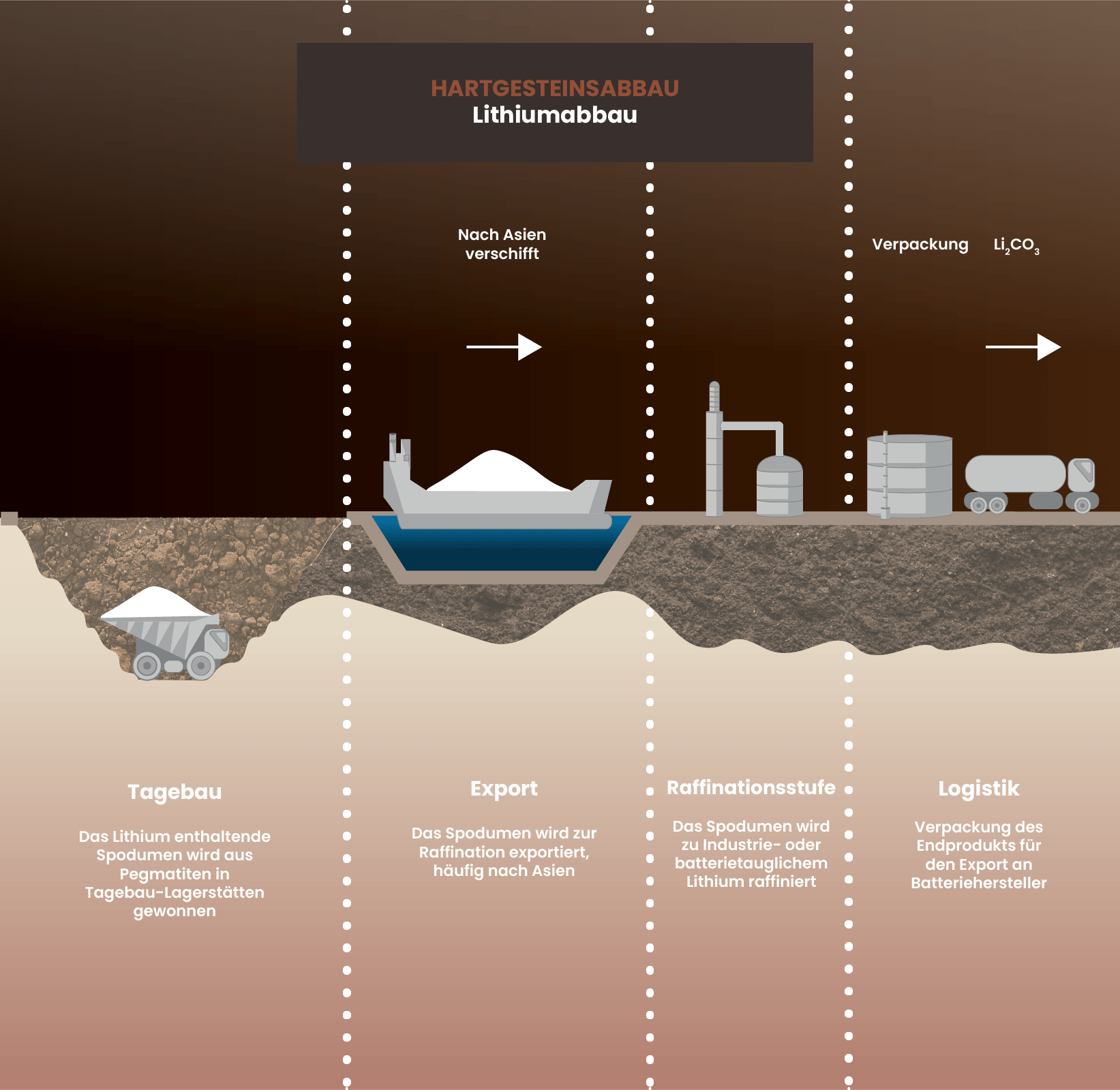 Beim Hartgesteinsbergbau wird Lithium aus Schotter im Tagebau gewonnen. Dieser Prozess erfordert umfangreiche Ausgrabungen, den Transport des Materials zur Verarbeitung nach Übersee und mehrere Raffinationsstufen, bevor das Lithium die Batteriehersteller erreicht. Bei diesem Verfahren dauert es ungefähr 3 Monate, bis die Mine auf den Markt kommt.